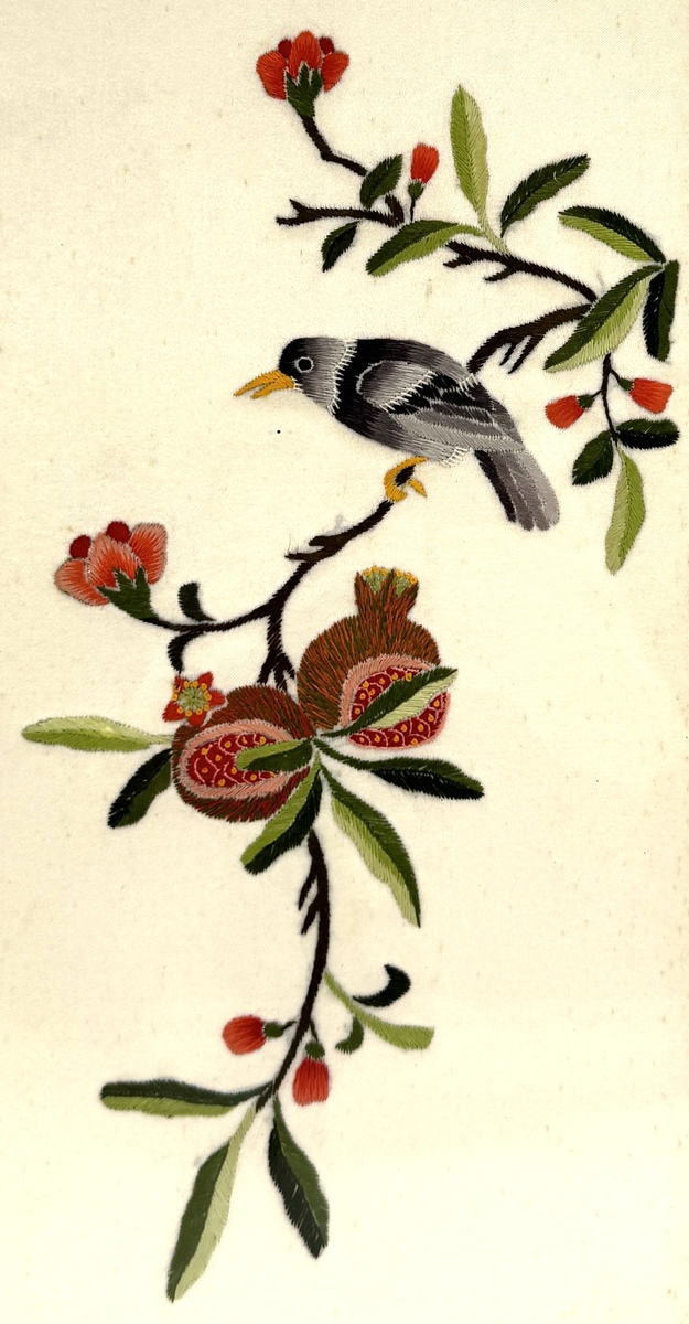Hand geborduurde zijdeapplicatie, omstreeks midden 20e eeuw, Chinese stijl met vogel op bloeiende tak en open granaatappel. Zijdegarens op zijden ondergrond in diverse tinten groen, rood en grijs. Omlijst met goudkleurige passe-partout en achter glas ingelijst. Traditioneel motief met symbolische verwijzing naar voorspoed en vruchtbaarheid.