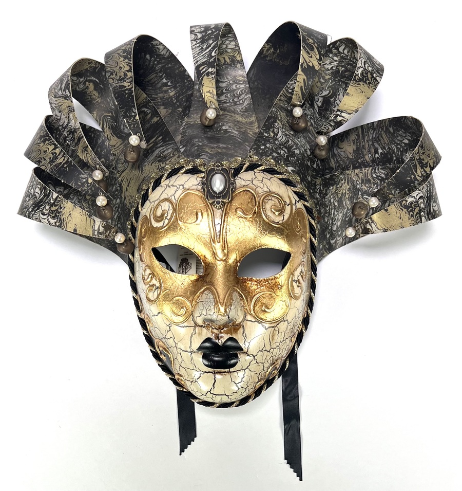 Venetiaans papier-maché masker van Maschera del Galeone, omstreeks eind 20e eeuw, handbeschilderd in traditionele Jolly-stijl met craquelé-effect, goudaccenten en zwarte lippen. Bovenop voorzien van gemarmerde, geluste decoratieve elementen met parels en kralen. Achterzijde gestempeld en voorzien van label met certificaat.