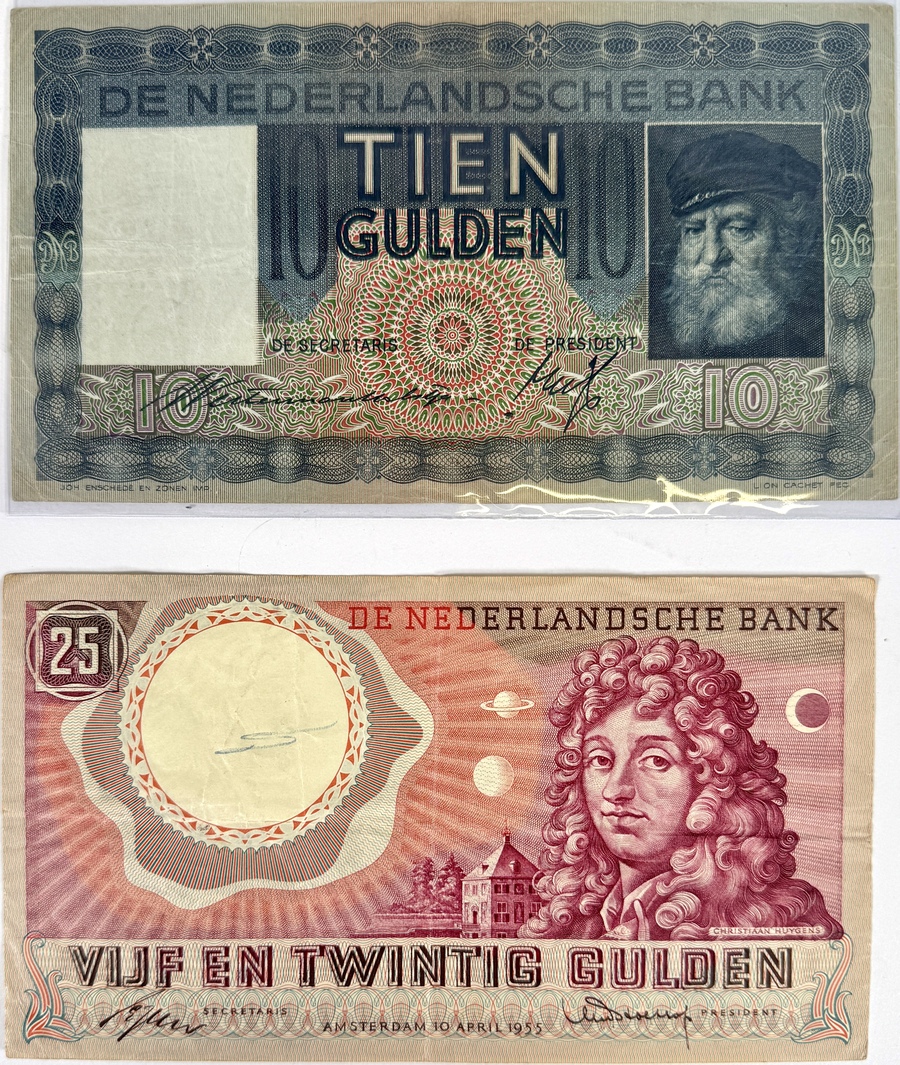 Twee Nederlandse bankbiljetten: 10 gulden (1943) met Rembrandt van Rijn, ontworpen door Lion Cachet, en 25 gulden (1955) met Christiaan Huygens, ontworpen door R.D.E. Oxenaar. Gedrukt op bankbiljetpapier in offsetdruk en diepdruk met geometrische patronen en guilloche-lijnen. Midden 20e eeuw.