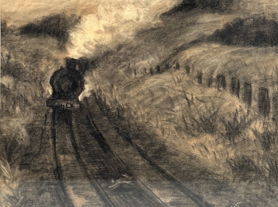 Houtskooltekening op papier, ongesigneerd, midden 20e eeuw. De expressieve voorstelling toont een stoomlocomotief die in een golvend landschap met houten afrasteringen rijdt, begeleid door een grote rookpluim.