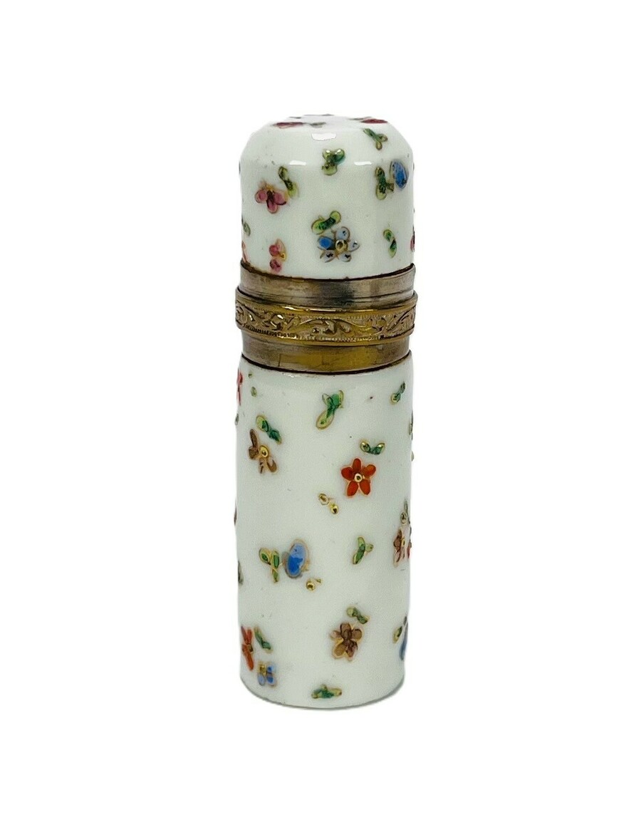 Porseleinen parfumflacon, omstreeks midden 19e eeuw, met handgeschilderde polychrome bloemendecoratie en vergulde metalen monturen. Uitgevoerd met een scharnierend deksel en glazen stop. Rococo-geïnspireerd, bedoeld voor persoonlijk gebruik tijdens reizen. Opvallend zijn de rijke florale motieven rondom en de fijne graveringen op het montuur.