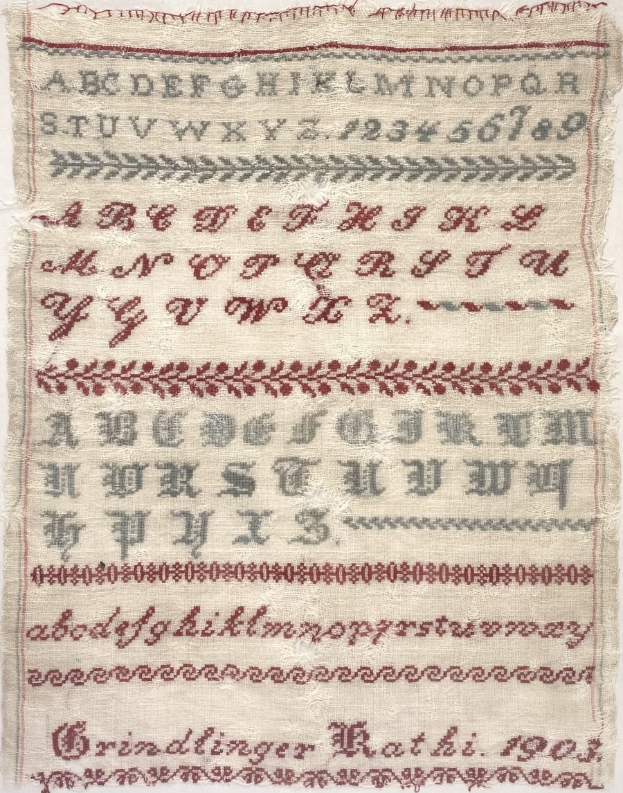 Borduurwerk vervaardigd op een lichte textiele ondergrond, de maker is Grindlinger Kathi en gedateerd 1903. Het borduurwerk toont een alfabet in drie verschillende lettertypes, een reeks cijfers en diverse decoratieve patronen. De randen van de stof zijn gerafeld en de kleuren van het garen zijn rood, blauwgrijs en bruin.