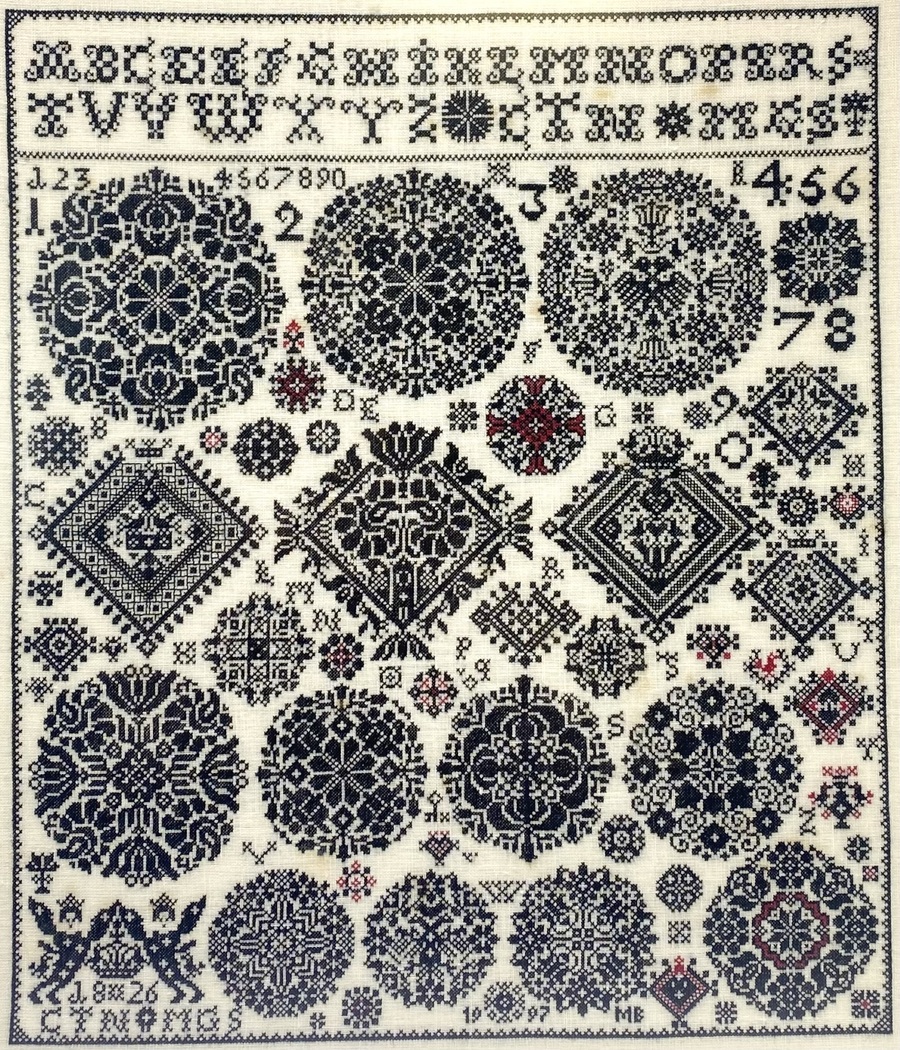 Merklap uit 1997, uitgevoerd in kruissteekborduurwerk op linnen naar antiek voorbeeld. De voorstelling bevat alfabetten, cijfers en een reeks geometrische medaillons in zwart garen, met enkele rode accenten. Onderaan geborduurd met initialen MB en het jaartal 1997. Gevat in een houten lijst met goudkleurige binnenrand en donkerrode afwerking.