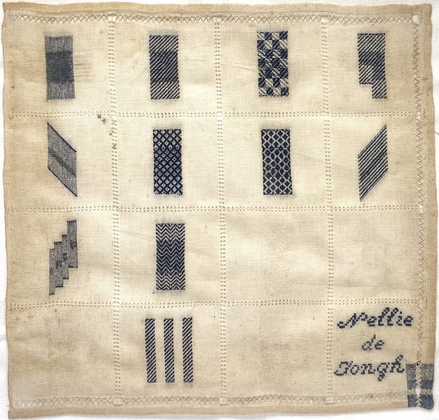 Merklap uit het begin van de 20e eeuw, uitgevoerd in stop- en weefsteken op linnen. De lap is opgebouwd uit twaalf vakken met uiteenlopende geometrische patronen in donkerblauw borduurgaren. In het onderste rechter vak is de naam Nellie de Jongh geborduurd. De merklap toont duidelijk de educatieve functie van merklappen als oefenstuk voor naaldwerk.