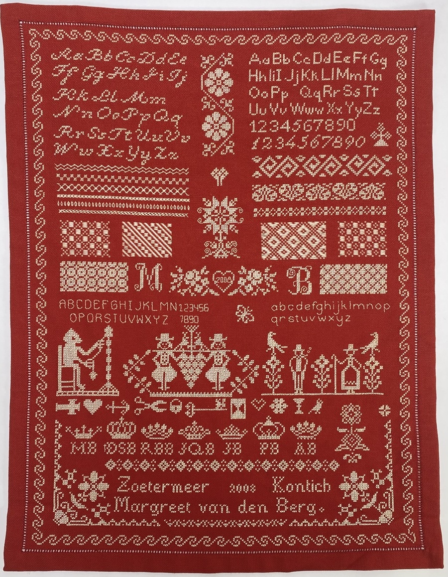 Merklap uit 2008, uitgevoerd in kruissteekborduurwerk op linnen of katoen. De voorstelling bevat meerdere alfabetten, cijferreeksen, randversieringen, bloemmotieven, kronen en geometrische patronen, gecombineerd met figuratieve scènes zoals een spinnewiel en paren in traditionele kleding. Onderaan geborduurd met de tekst Zoetermeer 2008 Kontich.
