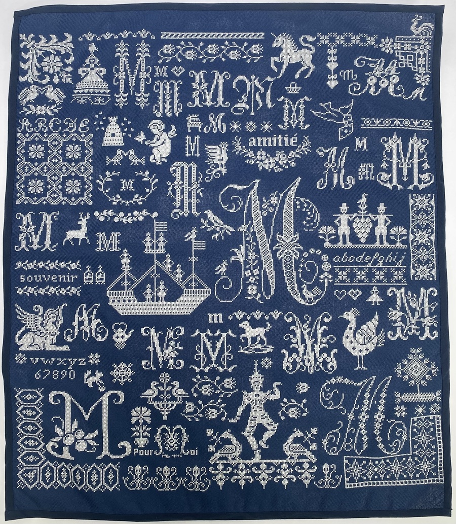 Merklap uit de 20e eeuw, Frans, vervaardigd in kruissteekborduurwerk op katoenen ondergrond. De voorstelling bevat diverse alfabetten, monogrammen en decoratieve motieven, met nadruk op de letter M in uiteenlopende stijlen. Daarnaast zijn tekstfragmenten, een schip, dieren, mythische figuren en bloemornamenten zichtbaar.