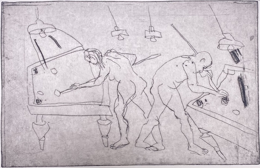 Ets op papier van Peter Bohl, gedateerd 1993, in minimalistische lineaire stijl met contourlijnen. De voorstelling toont twee naakte figuren die biljart spelen onder hangende lampen, waarbij de tafels en ballen schetsmatig zijn weergegeven. Rechtsonder met potlood gesigneerd Peter Bohl 1993 en linksonder genummerd oplagenummer 4/6.