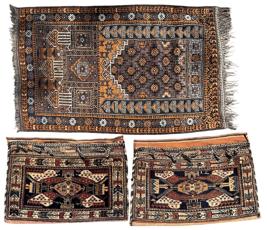 Bidkleed en twee kussens, midden 20e eeuw, uitgevoerd in wol op katoen, handgeknoopt en handgeweven. Het bidkleed toont een mihrab-vormige nis met bloem- en geometrische motieven in roodbruine en oranje tinten met contrasterende rand. De kussens tonen enerzijds eenvoudige aardetinten, anderzijds rijk uitgewerkte geometrische patronen in rood, blauw en beige.