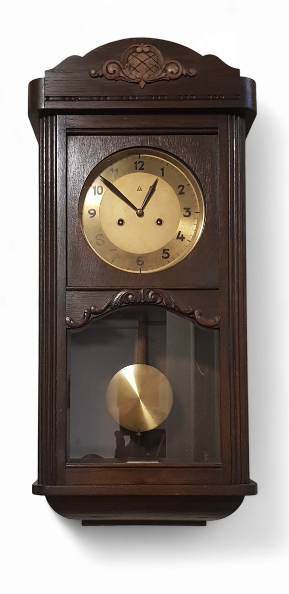 Regulateur, eerste helft 20e eeuw, uitgevoerd in eikenhout met messing wijzerplaat en glazen deurpaneel. De kast is voorzien van neorenaissance details zoals snijwerk in het bovenfront en cannelures aan de zijden. Het uurwerk heeft een messing slinger, Arabische cijfers en twee opwindgaten. De slinger is zichtbaar achter glas in de onderkast.