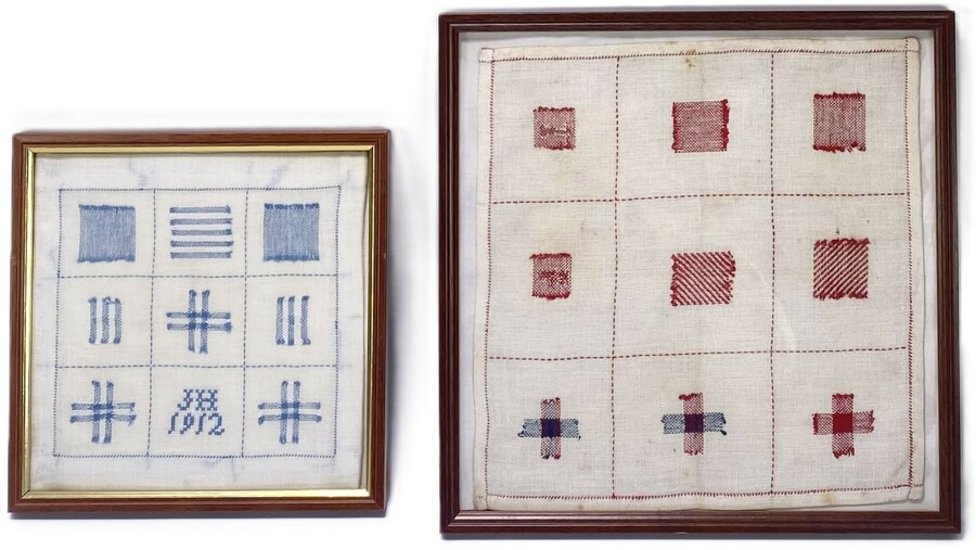 Twee merklappen uit begin 20e eeuw, uitgevoerd op linnen met borduurwerk in rood en blauw katoenen garen. De linker lap draagt onderaan de datering 1912 en toont geometrische patronen en kruisvormen, terwijl de rechter lap stopwerk in rood en rood-blauw bevat. Beide stukken zijn ingelijst in houten lijsten en dienden als oefenwerk voor handwerkonderwijs.