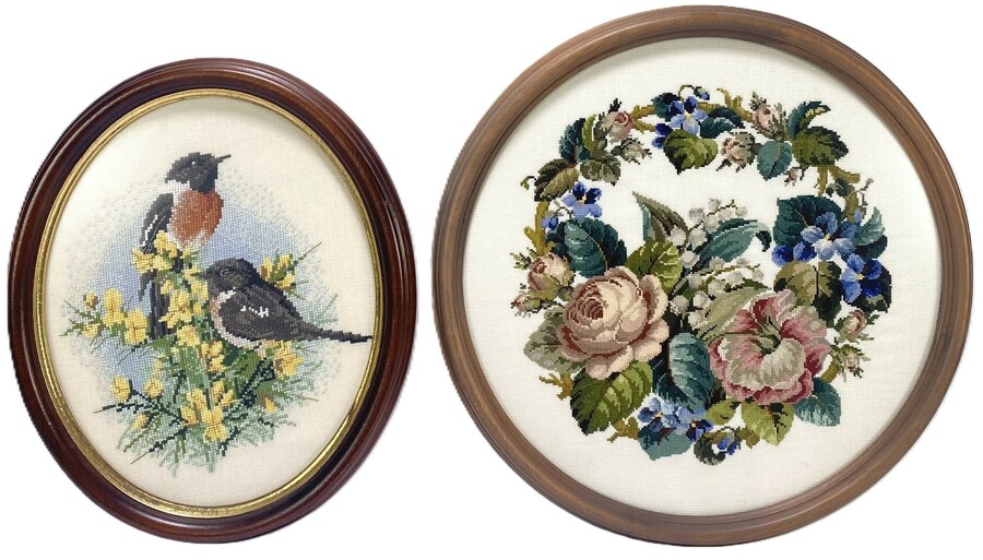 Twee ingelijste borduurwerken uit het midden van de 20e eeuw. Een borduurwerk, met een ovale vorm, toont twee vogels op een tak met gele bloemen. Het andere borduurwerk, met een ronde vorm, toont een krans van bloemen. Beide werken zijn ingelijst in een houten lijst, waarbij één een goudkleurige binnenrand heeft.