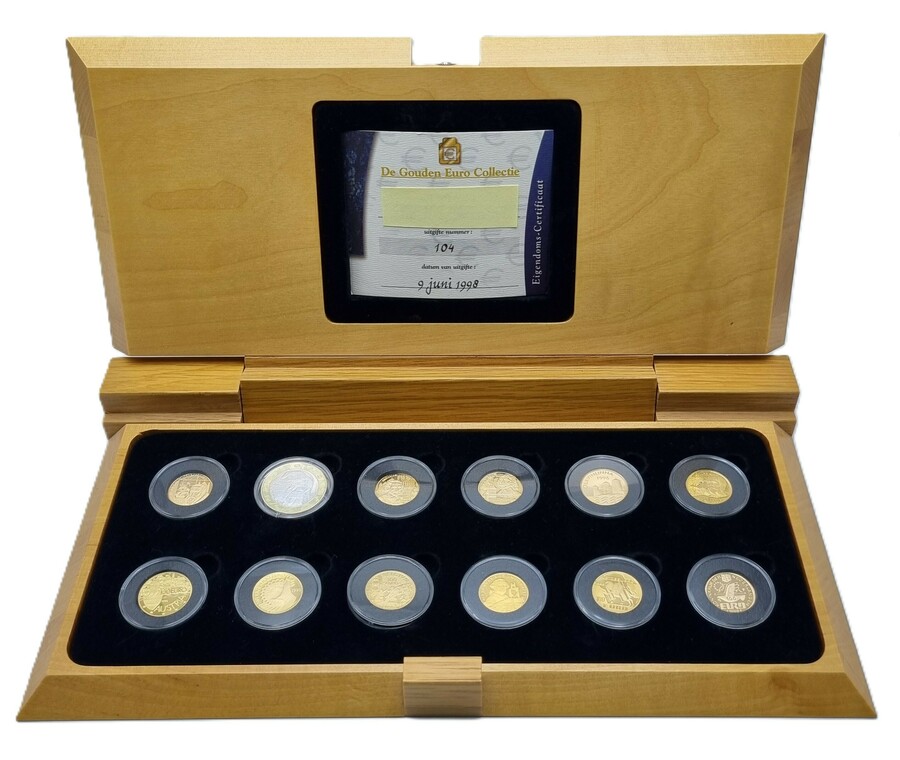 Set van twaalf gouden en zilveren penningen in houten presentatiekist, uitgegeven als “De Gouden Euro Collectie” op 9 juni 1998, genummerd certificaat 104. De penningen zijn vervaardigd in 18 tot 23,6 karaat goud, waarvan een penning deels gecombineerd met zilver 925, met gegraveerde portretten en historische voorstellingen. Inclusief originele luxe cassette van hout en map met documentatie.