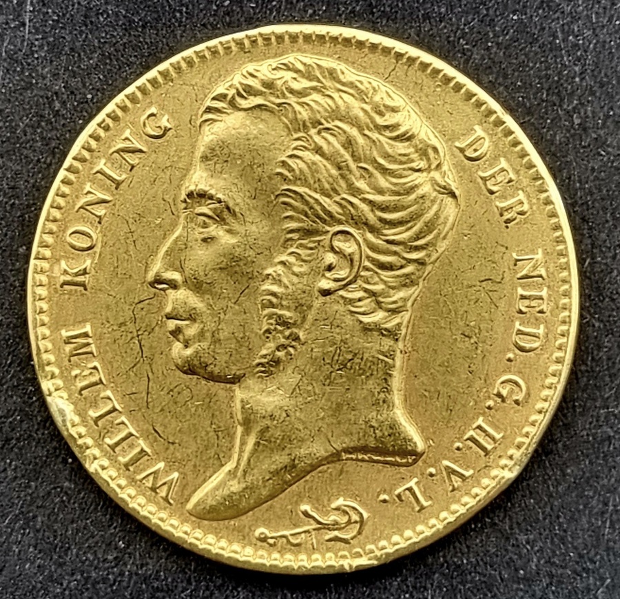 Gouden tientje (10 Gulden) uit 1825 van Koning Willem I (1815–1840), geslagen in Brussel (muntteken B). De munt bevat 900/1000 goud met een gewicht van 6.72 gram en is een van de eerste officiële gouden munten van het Koninkrijk der Nederlanden. De keerzijde toont het gekroonde Nederlandse wapen en de datering.
