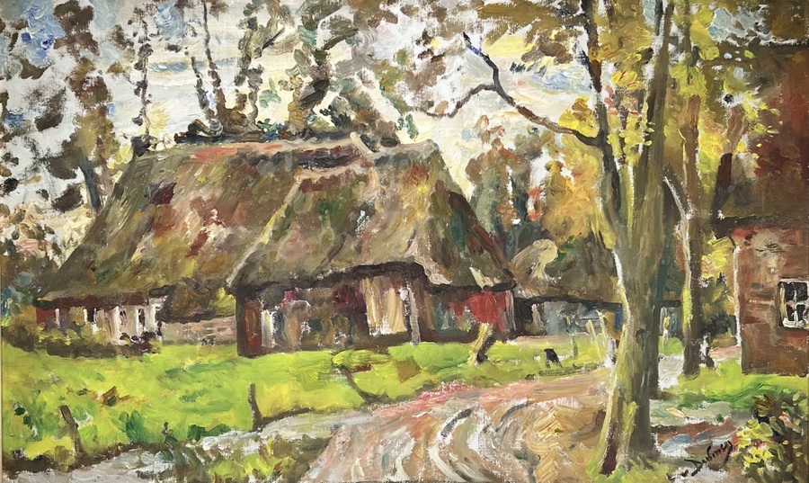Schilderij door Erasmus Bernhard van Dulmen Krumpelman (1897–1987), uitgevoerd in post-impressionistische stijl, olieverf op doek Het werk toont een Drents landschap met rietgedekte boerderijen, bomen en zandpad, datering midden 20e eeuw. Uitgevoerd in levendige kleurtoets met zichtbare penseelvoering. Het werk is rechtsonder gesigneerd en bevindt zich in een lichte houten lijst.