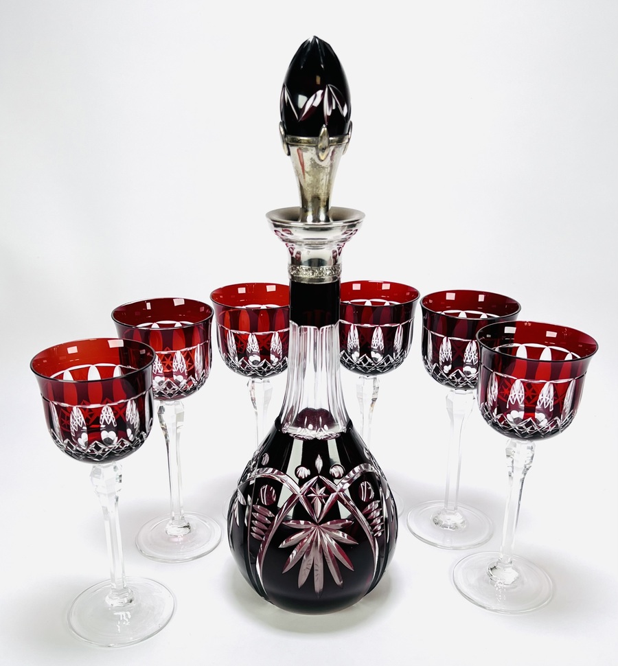 Set van zes kristallen likeurglazen en een kristallen karaf in historistische stijl, tweede helft 19e eeuw. De likeurglazen zijn uitgevoerd in de overmanteltechniek met een robijnrode laag (Rubin Glas) en diep geslepen met ster- en waaiermotieven. De karaf heeft een zilveren kraag en een zilver gemonteerde stop.