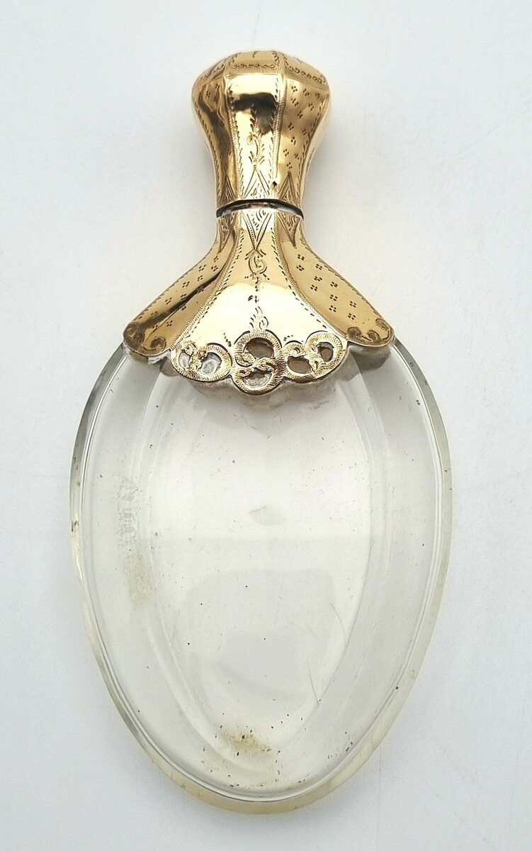 Antiek liggend parfumflesje uit de tweede helft 19e eeuw, Hollandse Biedermeier. Het parfumflesje bestaat uit helder geblazen glas, 14 karaat gouden applicatie en een scharnierende dop van 14 karaats goud. Het goudwerk is gegraveerd en voorzien van een ajour bewerkte kraag. De dop is gemerkt met het Nederlandse eikenbladkeur (1853–1905)., het originele glazen stopje is aanwezig.