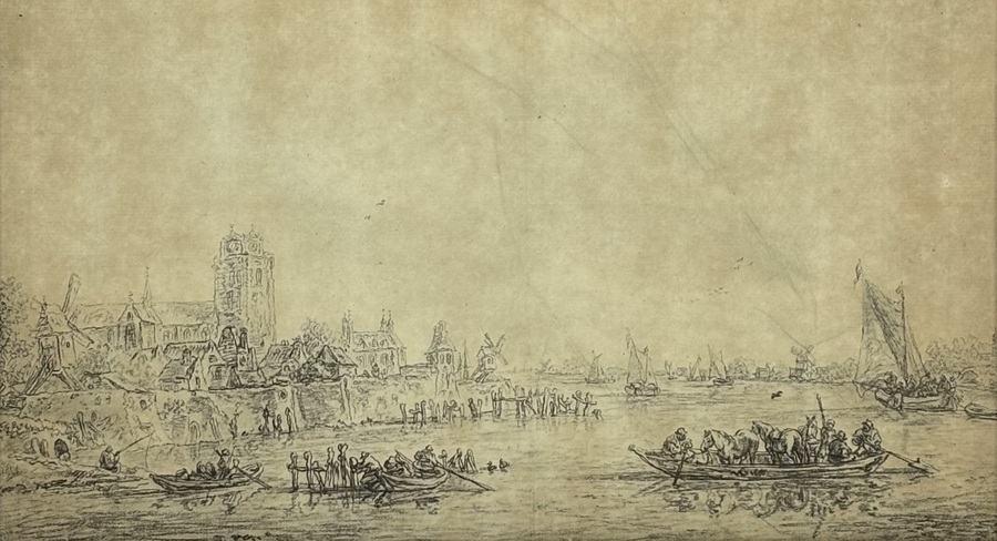 Facsimile ets op papier naar Jan van Goyen (1596–1656), voorstellende het stadsgezicht van Dordrecht gezien vanaf Zwijndrecht. Gedrukt in zwarttinten met fijne lijnvoering naar het 17e-eeuwse origineel. Nederlandse uitgave uit de eerste helft van de 20e eeuw, voorzien van opschrift “Collectie H.W. Assies” op de achterzijde, in een houten lijst.