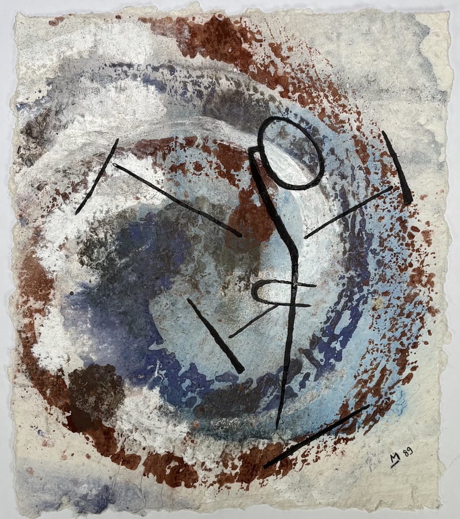 Gemengde techniek met acrylverf en inkt op handgeschept papier, abstracte compositie met dynamische cirkelbewegingen in aardetinten en zwart, Rechtsonder monogram M en gedateerd 89.