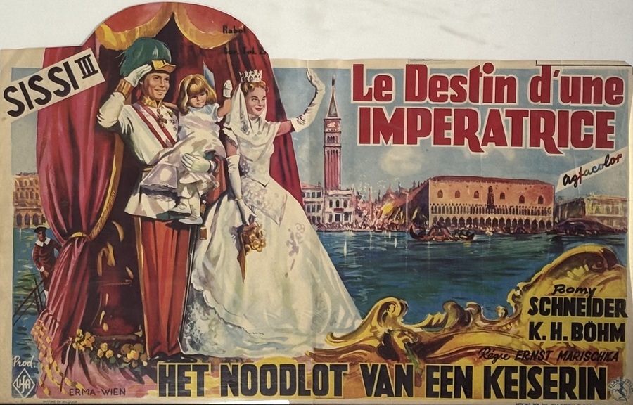 Kleuren lithografische filmposter, ontworpen door Rabol voor Sissi III – Le Destin d’une Impératrice (Het noodlot van een keiserin), naar de film van Ernst Marischka met Romy Schneider en Karlheinz Böhm, uitgebracht in 1957. Gedrukt in België. De voorstelling toont het keizerlijke paar met kind, staand voor Venetië, uitgevoerd in levendige Agfacolor-stijl en voorzien van originele Erma-Wien opdruk.
