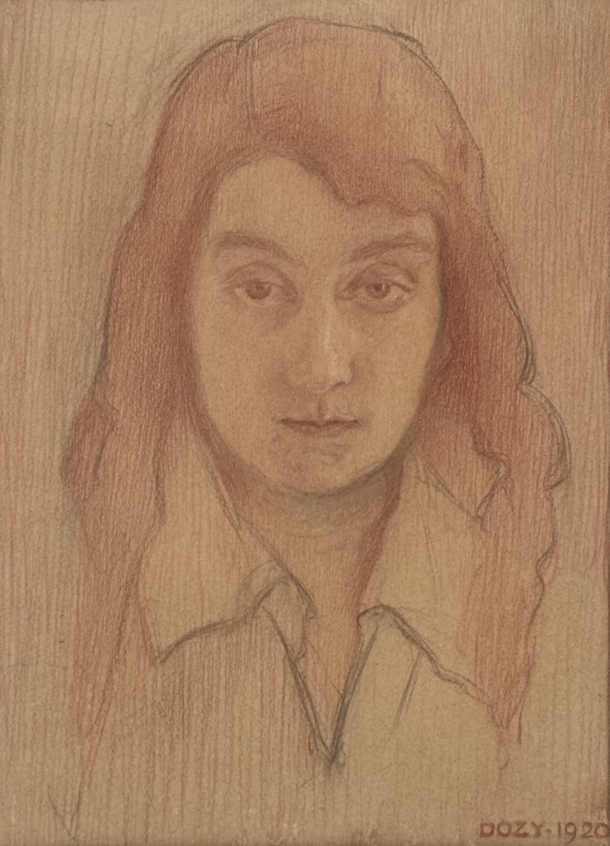 Portrettekening door Reinhart Dozy (1880–1947), uitgevoerd in potlood en krijt op papier, gedateerd 1920. Het werk toont een meisjesportret in sobere, realistische stijl met zachte arceringen en roodbruine kleurnuances. Het werk bevindt zich in een neutrale lijst met passe-partout.