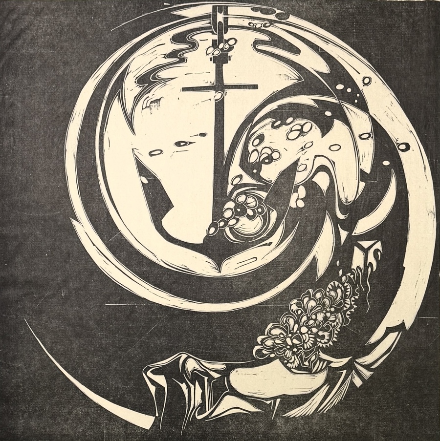 Houtsnede op papier door Jac. Jongert (1883–1942), circa 1918–1925, in een zwart-witte expressionistische stijl. De prent toont de abstract symbolische voorstelling "Het Anker" met een centraal kruis binnen een dynamisch roterende cirkel. Het werk is kenmerkend voor de grafiek uit de Nederlandse Art Deco en is afkomstig uit het tijdschrift Wendingen. Rechtsonder is gemeld: “HET ANKER / GESNEDEN IN PALM-KOPS / DOOR JAC JONGERT