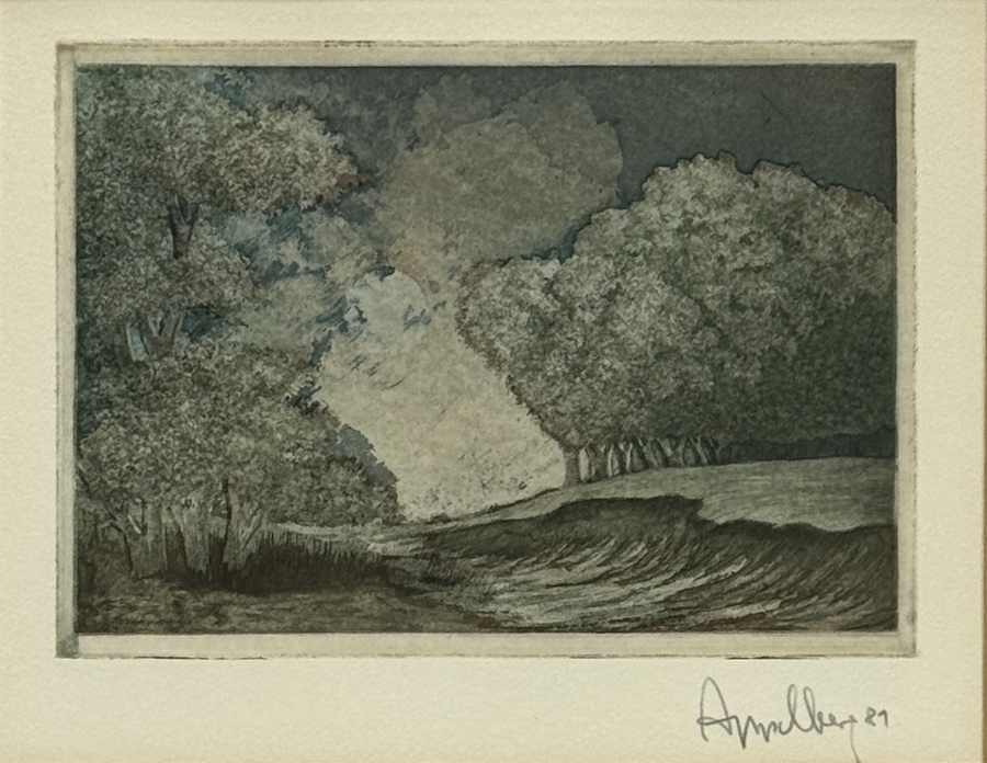Aquatint op papier, 1981. Landschappelijke voorstelling met bomenrij en open lucht, in grijsgroene en blauwgrijze tinten. Onduidelijk gesigneerd en gedateerd 81, rechtsonder in potlood. Verso label Herman van Leeuwen Kunsthandel. Ingelijst met crèmekleurige passe-partout.