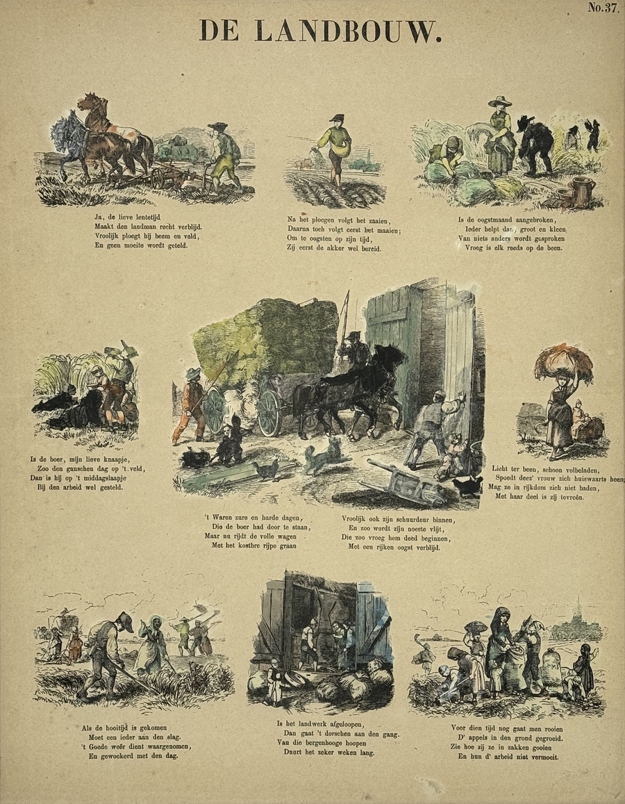 Kleurlitho op papier, getiteld “De Landbouw.”, nr. 37, eind 19e eeuw. De prent toont in negen scènes de seizoensgebonden arbeid van de boer, begeleid door moralistische verzen. Uitgevoerd in zachte tinten en klassieke educatieve stijl, waarschijnlijk Nederlandse uitgave. Ingelijst in een donkerhouten lijst met label van Kunsthandel Muurtooi, Arnhem.