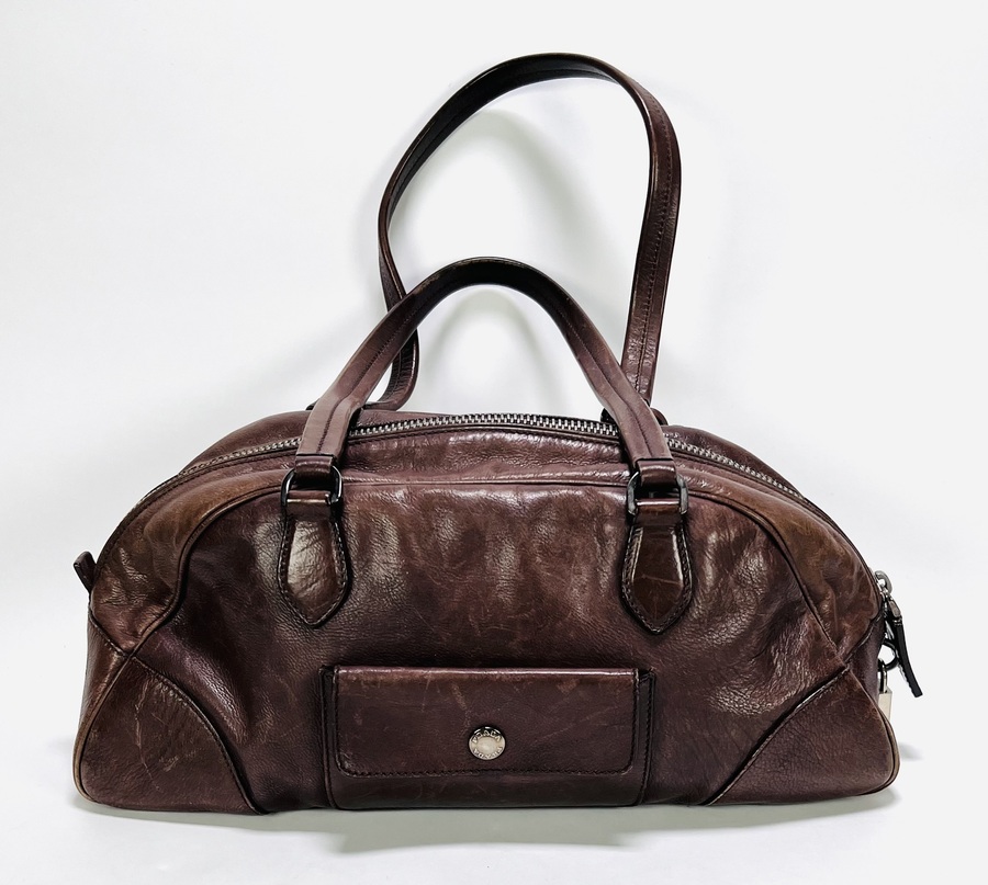 Lederen Prada bowling handtas uit circa de jaren 2000, vervaardigd uit bruin gewassen leder met gestikt lederwerk en metalen ritsen en hardware. Het model heeft twee handvatten en een voorvak met Prada-logo op de knoop. De voering bevat een jacquard merkmotief en een label met "PRADA MADE IN ITALY".