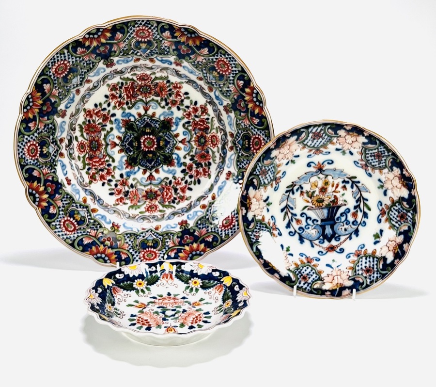 Drie decoratieve wandborden van Koninklijke Tichelaar Makkum, vervaardigd van aardewerk, circa 1945–1960. De wandborden zijn polychroom beschilderd met rijke florale motieven in kobaltblauw en rood. Dit Friese aardewerk is gemerkt met Makkum 1055 en de schildersinitialen WK.
