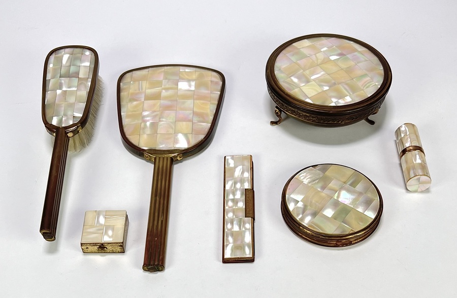 Een zevendelige kap en make-up set uit de Art Deco periode (circa 1920–1935), bestaande uit een spiegel, borstel, kam, poederdozen, pillendoosje en lipstickhouder. De set is vervaardigd uit messing met een inleg van vierkante stukjes parelmoer in een geometrisch mozaïek.