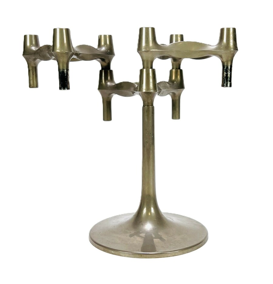 De verchroomde kandelaar is een iconisch ontwerp van Werner Stoff en Hans Nagel voor BMF, Duitsland, circa 1965–1975. De kandelaar is een modulaire constructie op een hoge, trompetvormige voet en met negen houders. De kandelaar is kenmerkend voor de Mid-century modern stijl, onderzijde merkteken.
