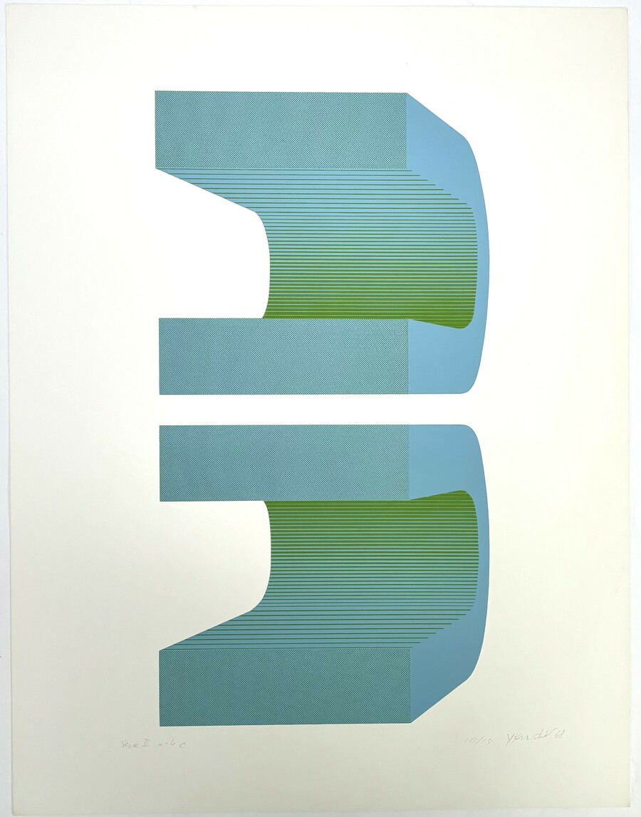 Zeefdruk op papier, geometrisch-abstracte compositie in blauw-groene kleurvlakken door Yvonne Kracht (1931). Linksonder vermelding Serie II no. 4c, rechtsonder oplagenummer 10/15, signatuur en datering.
