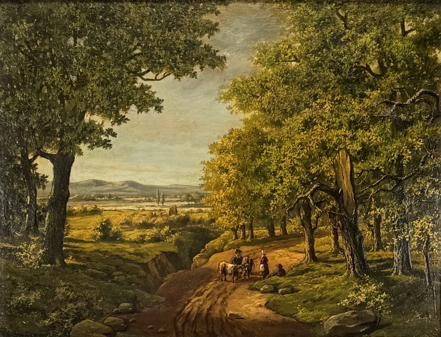 Olieverfschilderij op paneel, naar Barend Cornelis Koekkoek, tweede helft 19e eeuw. Het romantische landschap toont een zandweg met groep reizigers, paarden en een wagen, omgeven door hoge bomen en een vergezicht naar een vallei met heuvels. Het werk is uitgevoerd in warme groen- en aardetinten en geplaatst in een rijk gedecoreerde goudkleurige lijst. Linksonder gesigneerd BC Koekkoek.