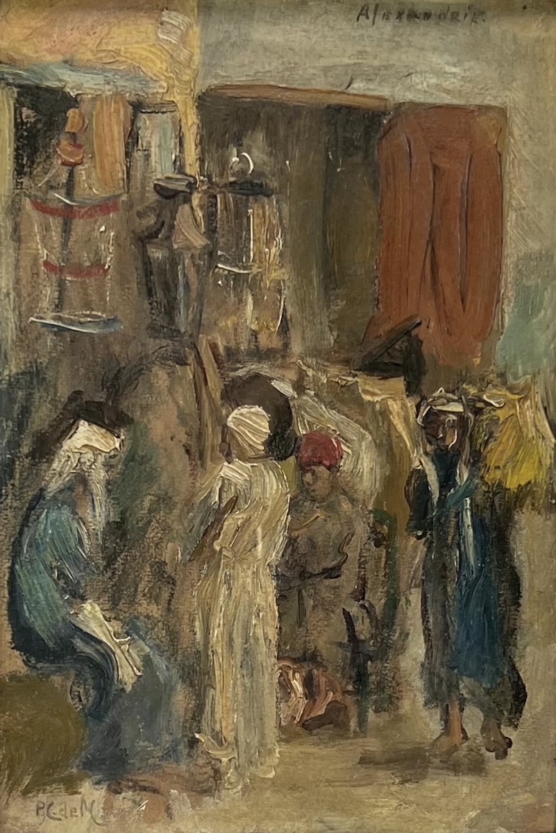 Olieverf op schilderskarton in impressionistische stijl met oriëntalistische invloeden door Pieter Cornelis de Moor (1866–1953), getiteld “Alexandrië”, eerste helft 20e eeuw. Het toont een straattafereel met figuren in traditionele kledij in warme aardetinten en blauw. Gesigneerd linksonder en getiteld bovenaan, met Rotterdamsche Kunstkring-etiket op de achterzijde.