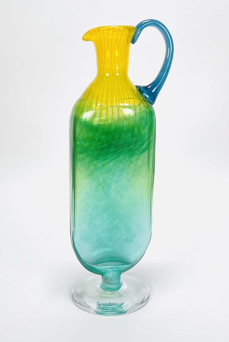 Glazen karaf door Kjell Engman (1946) voor Kosta Boda, uit de "Bon Bon"-serie, 1989-2005. Dit Scandinavisch design object is mondgeblazen en heeft een helder, geel naar groen en turquoise kleurverloop en een aangezet kobaltblauw handvat. Het object is op de voet gesigneerd met K Engman, modelnummer 89067 en sticker Kosta Boda.
