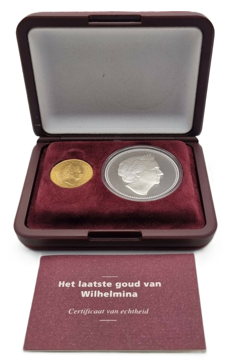 Set bestaande uit een gouden tientje van Koningin Wilhelmina 1927 en een zilveren penning “Het laatste goud van Wilhelmina”, vervaardigd door de Rijksmunt te Utrecht. Geslagen in goud 900/1000 (diameter 22,5 mm) en zilver 925/1000 (diameter 38 mm). Neoklassieke stijl, portret en wapen in reliëf, gemonteerd in originele cassette met certificaat van echtheid, Nederland, 20e eeuw.