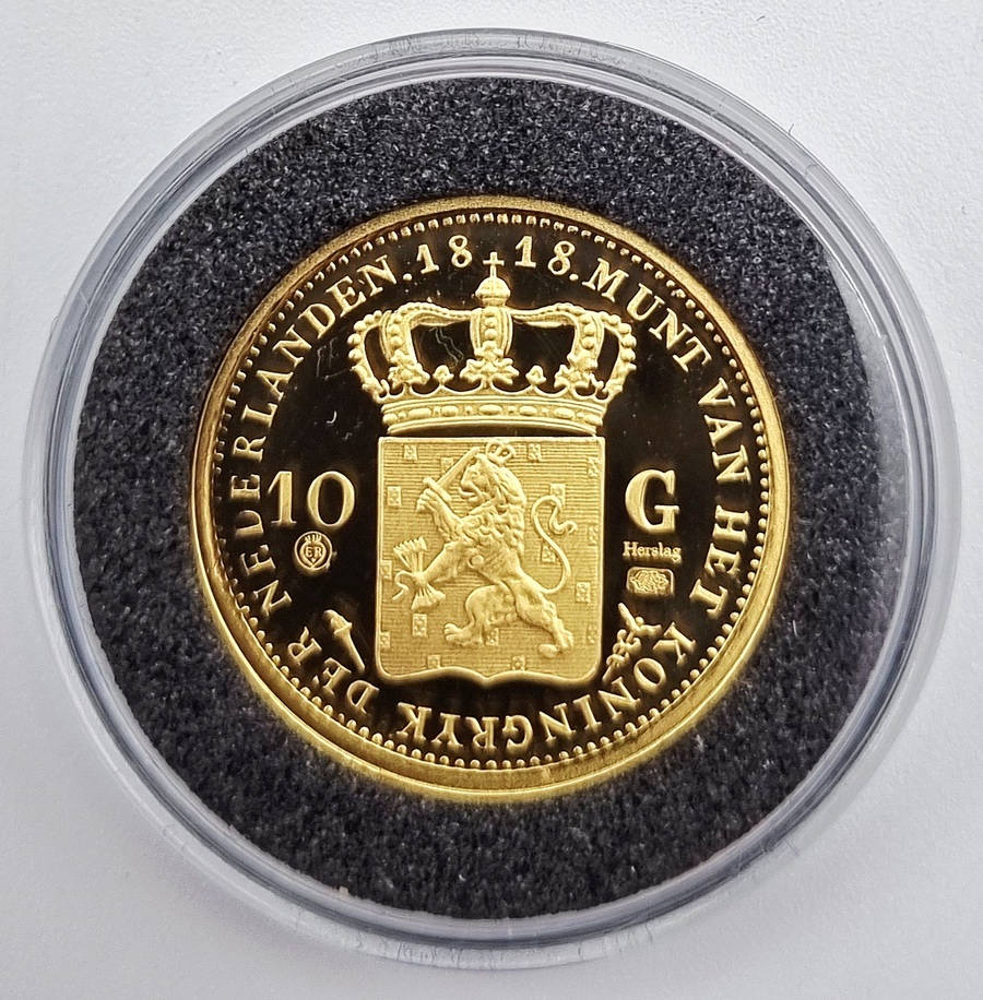 Naslag van de Nederlandse gouden 10 guldenmunt 1818, geslagen door De Koninklijke Nederlandse Munt in proofkwaliteit en uitgegeven door Het Nederlandse Muntenhuis. De munt is vervaardigd uit 14 karaat goud met het portret van koning Willem I naar ontwerp van Auguste François Michaut, en vertoont het Nederlandse wapen op de keerzijde. Gelimiteerde oplage van 2000 stuks met certificaat van echtheid en officiële slag te Utrecht.