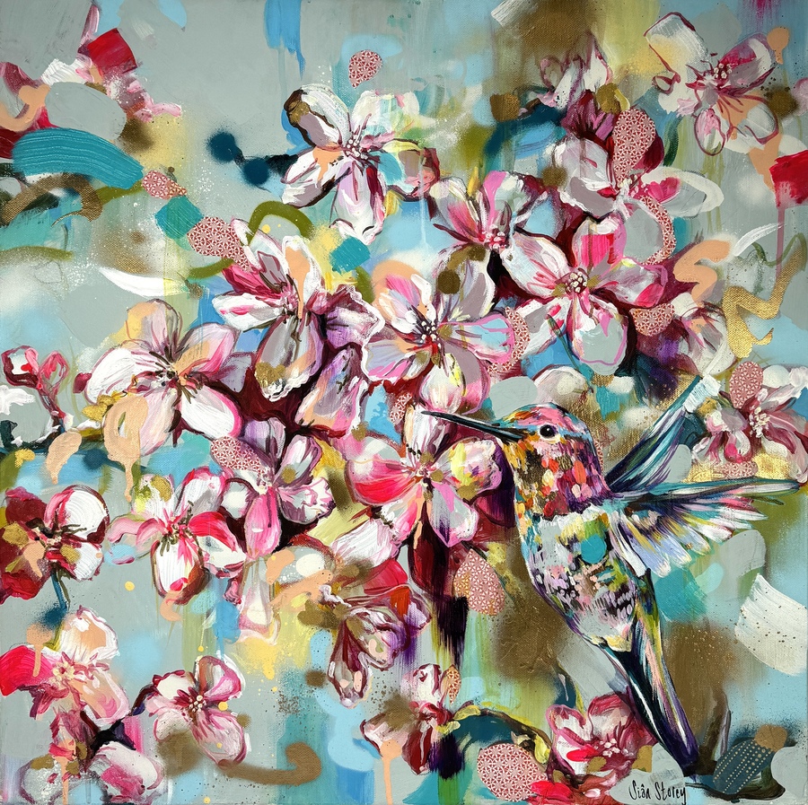 Mixed media schilderij op doek door Sian Storey, gedateerd 2018. Het werk is uitgevoerd in hedendaagse figuratieve stijl en getiteld "Hanami In Bloom". De compositie combineert acrylverf, spuitverf en Japans papier om een kolibrie tussen kersenbloesems te verbeelden. Het wordt gekenmerkt door felle kleuren, abstracte achtergronden en gouden accenten. Het werk is rechtsonder gesigneerd, afkomstig uit het Verenigd Koninkrijk.