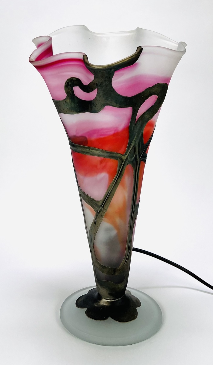 Art Nouveau stijl tafellamp, tweede helft van de 20e eeuw, uitgevoerd in glas en metaal. De bloemvormige kap is van meerlagig, geblazen glas in roze, oranje en wit met gesatineerde afwerking, omwikkeld door een metalen montuur in organisch rankmotief. De lamp rust op een ronde glazen voet en vertoont Art Nouveau vormgeving, lijnvoering en materiaalgebruik.