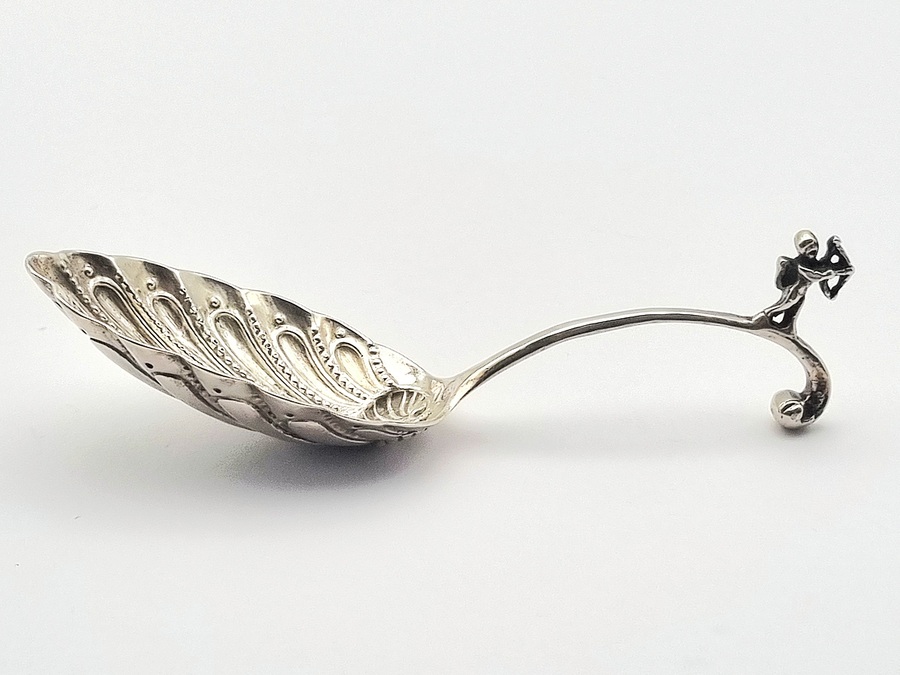 Zilveren roomlepel Den Haag, toegeschreven aan zilversmid Jacobus Koppenol in ca. 1785. De roomlepel is uitgevoerd in rococo stijl met een gedreven schelpvormige geciseleerde bak en en een steel die eindigt in een gegoten en gedetailleerde cupido.