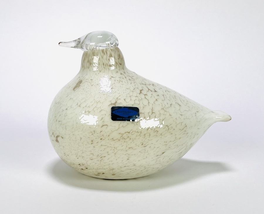 Glazen vogel, ontworpen door Oiva Toikka (1931–2019) voor Iittala, tweede helft 20e eeuw. De vogel is geblazen in transparant en wit gemarmerd glas met subtiele beige schakeringen. Onderzijde signatuur, zijkant originele fabriekssticker.