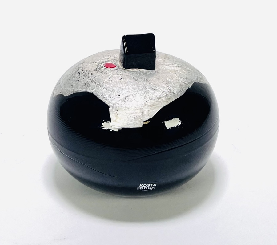 Glazen object "Wintergarden" uit de serie "Earth", ontworpen door Bertil Vallien (1938) voor Kosta Boda, Zweden. Dit bolvormige ontwerp in zwart glas heeft een zilverkleurig vlak met rode stip en een opstaand zwart huisje. Aan de onderzijde gesigneerd en genummerd door de kunstenaar, onder zijkant sticker Kosta Boda. Het object dateert uit de 21e eeuw, in originele verpakking.