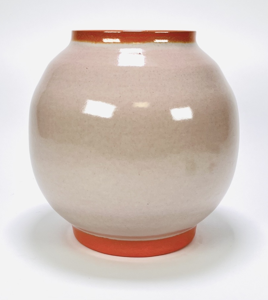 Keramische vaas van Pottenbakkerij De Vier Paddenstoelen, Utrecht, gedateerd 1929. Gedraaide vorm van aardewerk met glanzend oudroze glazuur en oranje accenten aan rand en voet. Onderzijde gemerkt met ruitvormig fabriekslogo, “UTRECHT” en nummer B 29. Typisch voorbeeld van Nederlandse modernistische keramiek uit het interbellum.