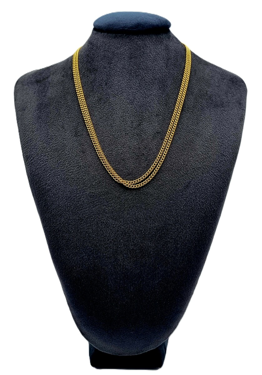 Een dubbelrijige schakelhalsketting van 18-karaat geelgoud, gemerkt 750, uitgevoerd in een klassiek gourmette patroon (curb chain).De halsketting bevat twee naast elkaar liggende rijen van vlakke ovale schakels, met een karabijnhaaksluiting.