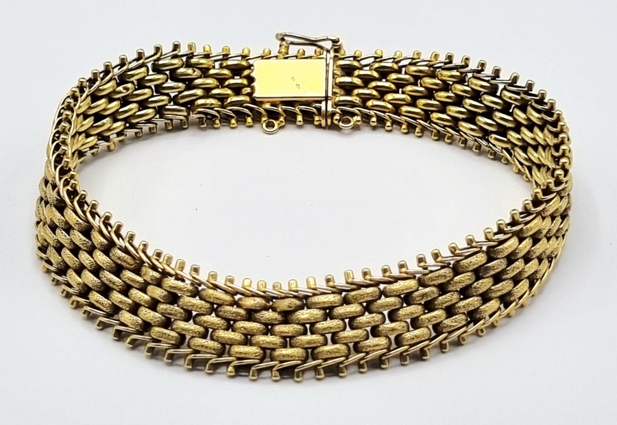 Een brede, geschakelde polsband uit de Mid-Century periode (ca. 1940–1960), uitgevoerd in 14-karaat geelgoud. De armband bestaat uit meerdere rijen soepel verbonden, gesatineerde schakels, wat resulteert in een breed en flexibel ontwerp, afgewerkt met een strakke baksluiting. Gemerkt met het Nederlandse eikenbladkeurmerk.