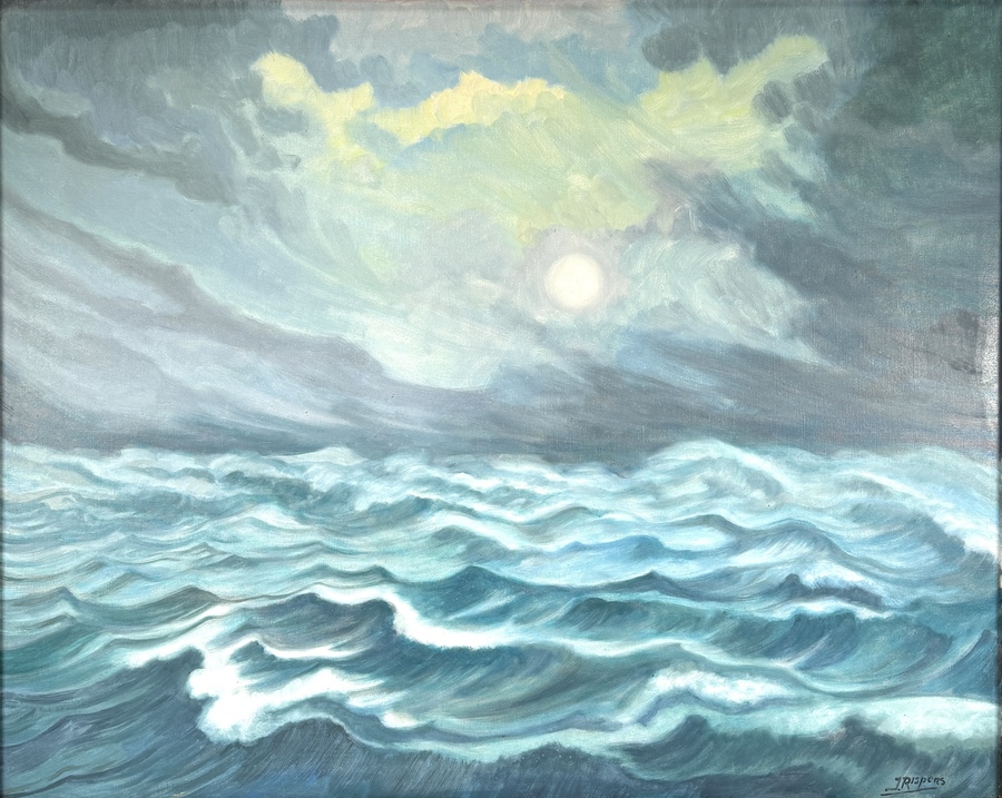 53. Olieverfschilderij, Jo Rispens, “Gezicht op de Noordzee v.a. Schiermonnikoog”, midden 20e eeuw