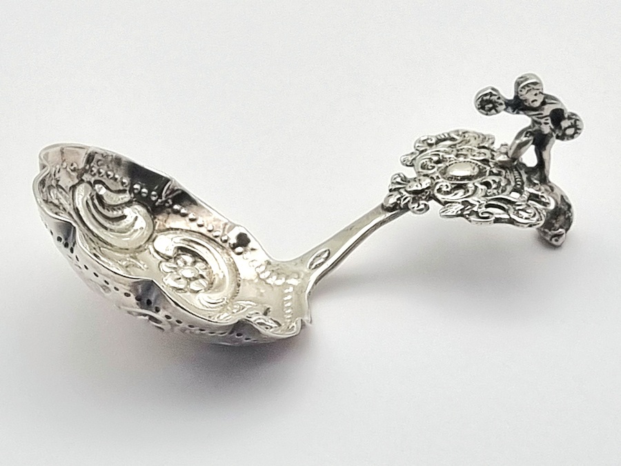 Zilveren roomlepel uit de rococo periode, vervaardigd omstreeks 1770 toegeschreven aan de Amsterdamse zilversmid Jacobus Visscher. De lepelbak is gedreven met ajour en rocaille motieven met een fabeldier. De steel eindigt in een gegoten putto op een ajour bewerkte cartouche.
