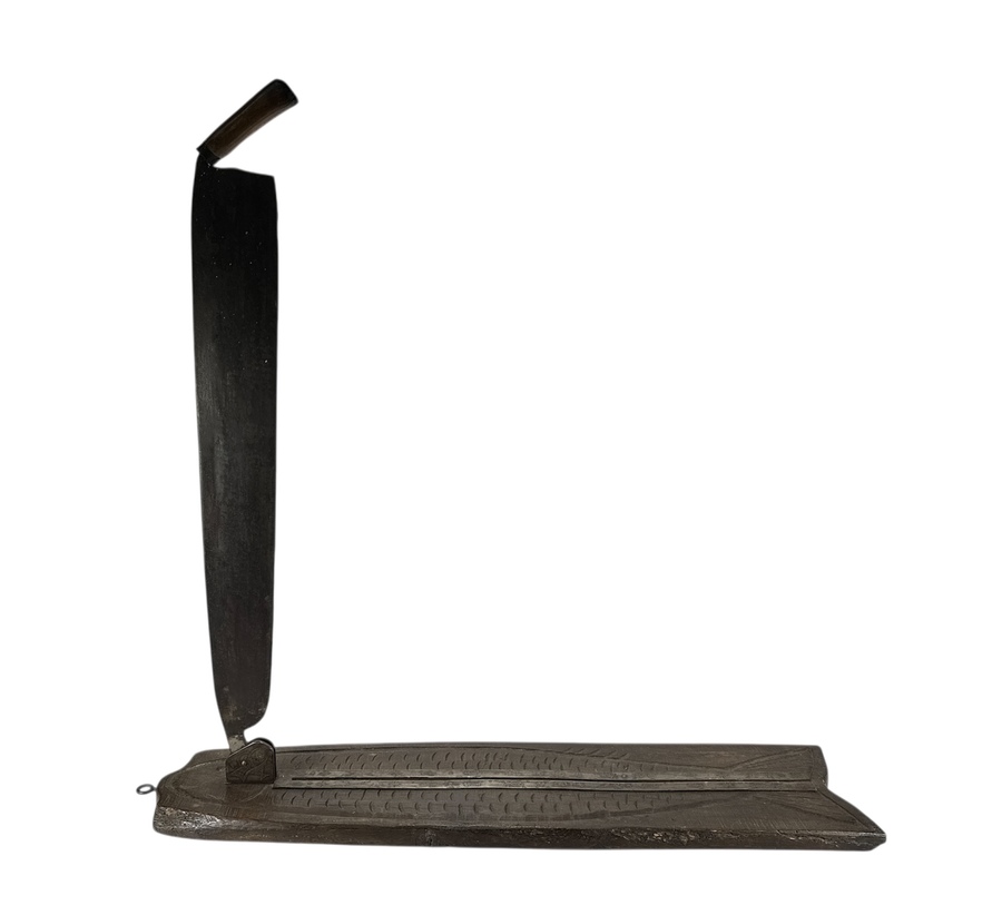 Deze vishakplank is een utilitair object vervaardigd uit donker hout met houtsnijwerk en voorzien van een lang scharnierend mes met houten handvat. De plank volgt de gestileerde contouren van een vis, inclusief een schaalpatroon op het oppervlak voor grip. Dit type gereedschap werd traditioneel gebruikt voor het fileteren van vis en is kenmerkend voor de Scandinavische volkskunst. De constructie en stijl dateren de plank in de eerste helft van de 20e eeuw.
