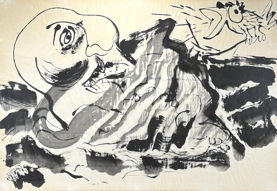 Oost-Indische inkttekening op papier, gedateerd op het midden 20e eeuw. De inkttekening toont een dynamische, abstract figuratieve confrontatie tussen een grote hoofd links en vogelachtig figuur rechts, gescheiden door een massief, donker vlak.