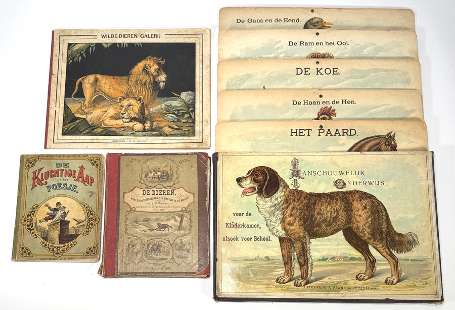 Verzameling van vier Nederlandse educatieve boeken en lesplaten over dieren, gedrukt op papier en karton, uit de periode tweede helft 19e eeuw tot circa 1920. De collectie omvat “De dieren, hun dienstbetoon aan den mensch en de natuur”, “Wilde-dieren galerij” en “De kluchtige aap en het poesje”, plus de cassette "Aanschouwelijk onderwijs" (M. A. Frank) .Op cassette met potlood: J.J.L. ten Kate (geb. 1819 - overl. 1889) en kleine sticker met inkt ‘ten Kate’.